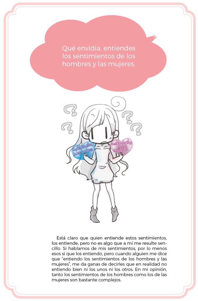 Además de contarnos su historia, Chii aprovecha la publicación para añadir páginas explicativas relacionadas con la sociedad japonesa, y su visión acerca de la identidad sexual, de género… y temas relacionados con el colectivo LGTBIQ+ no sólo allí, sino en todo el mundo. En esas páginas desarrolla temas que durante su historia igual ella no las tuvo en cuenta. Pero que, al desarrollar este manga quiso añadir para ayudar a entender mucho mejor su historia. No sólo trata temas como la reasignación de género, sino también cómo funcionan las relaciones afectivo sexuales sanas, y cómo de importante es la salud mental.