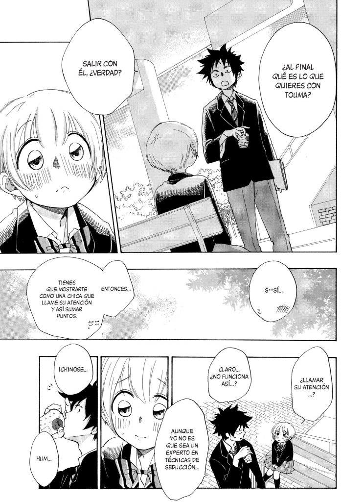 Lo que podría ser un triángulo sencillo: a Taichi le gusta Fustaba, a Futaba le gusta Touma, y a saber con cuál de todas las chicas que tiene alrededor Touma está él… se complica cuando el lector, desde casi el primer momento, se entera que en realidad a Touma le gusta Taichi. Desde siempre. Pero, obviamente, y como hemos comentado en varias reseñas sobre mangas que tratan temática queer como Sombras sobre Shimanami, por ejemplo, Touma no puede decir nada. A partir de ese momento entran en juego más personajes como los amigos de Taichi, cuyas personalidades y niveles educativos son muy dispares entre ellos; el grupo de fans “oficial” de Touma, encabezado por Mami Yagihara, una chica con las ideas muy claras y mucha perseverancia; o Itachi, la mejor amiga de Futaba que en seguida se percatará del secreto de Touma, pues ella tiene el mismo secreto respecto a su mejor amiga.
